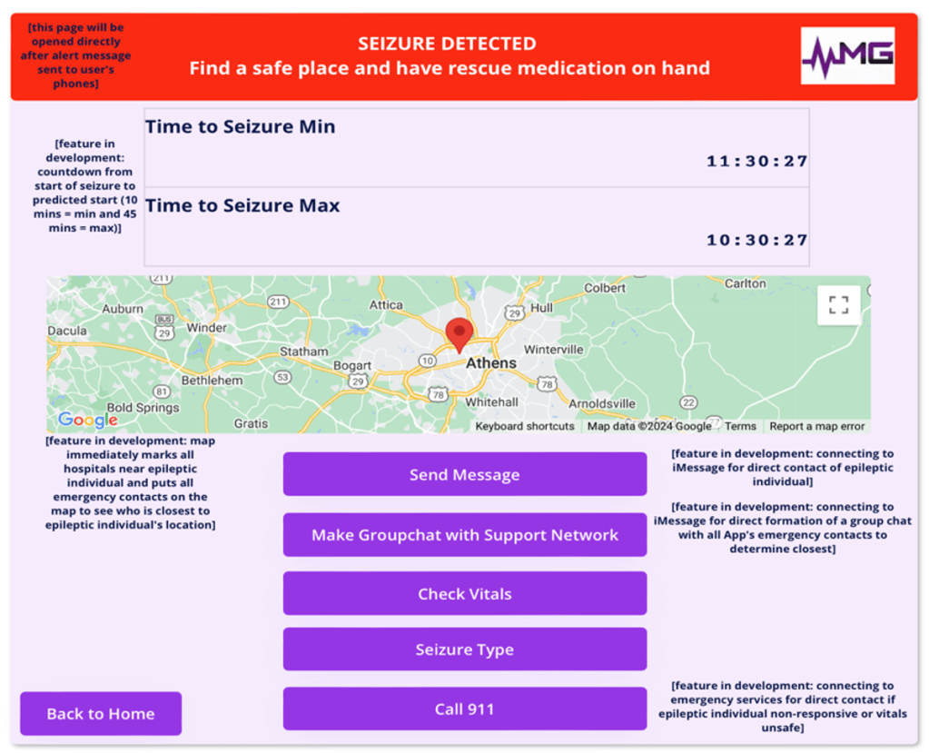- 3) The ALERT feature will be the one to come up once the biomarker sensor detects a seizure. This screen contains a countdown to the seizure, the support network map of emergency contacts, and vital sign activity with seizure type loading. Once loaded, recommended precautions will appear.